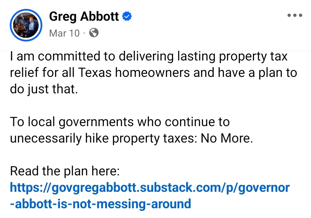 A recent campaign post from Gov. Greg Abbott (R) underscores an increasingly aggressive push on property tax policy ahead of the next legislative session and signals his desire to coordinate lawmakers to fundamentally reshape how Texas funds its schools.