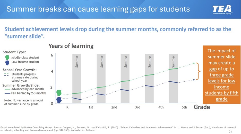 The commissioner's comments on TIA ran parallel to his ADSY messaging. In both his slides and commentary, Morath positioned ADSY as a structural tool to counter the well-documented effects of summer learning loss and noted that HB 2 now allows districts to access three-quarter day ADA funding; expand ADSY from PK–5 to PK–8; and integrate ADSY into voluntary summer learning, intersessional calendars, or full-year designs. The commissioner repeatedly returned to the underlying research, the cumulative learning gap created by inequitable summer access, the negative effects of shortened school weeks, and the significant single-year gains seen in ADSY campuses. Morath’s stance is clear: Extending instructional time is an evidence-based intervention, now paired with stable formula funding, that districts should strongly consider.