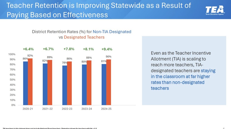The commissioner also framed TIA not as a vehicle to “make teachers better,” parroting arguments long made by ATPE that teachers aren’t waiting for more money to work harder; they largely are already giving their all. In the commissioner’s words, TIA is about improving retention by offering substantial compensation increases to those deemed to be the highest performing—those educators whose only option historically was to leave the classroom for administrative roles or other professional opportunities. He highlighted internal TEA research showing a roughly 9% retention benefit for designated teachers and asserted this retention effect grows stronger as more districts adopt TIA.
