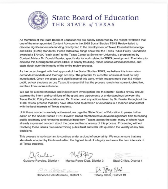 One of the most closely watched issues was continued debate over the development of the Social Studies TEKS and the role of outside contributors. Several SBOE members sent a formal letter raising concerns about the involvement of a Texas Public Policy Foundation (TPPF)-affiliated individual who was reportedly paid to assist in drafting portions of the standards. The letter questioned transparency, potential bias, and the broader precedent of outsourcing curriculum writing to politically affiliated groups.