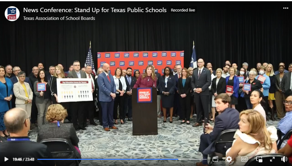 ANTI-VOUCHER PRESS CONFERENCE: A large group of superintendents and public education stakeholders, including ATPE, attending the TASA/TASB Convention Friday in Dallas held a press conference expressing their united opposition to a private school voucher program. "We are in a position of no compromise," said Dr. Christopher Moran, superintendent of Whitehouse ISD. "We're not interested in compromising for vouchers to gain school funding. This is a hill that we're willing to die on. We believe so strongly in public schools that we are not willing to compromise for the governor's agenda."